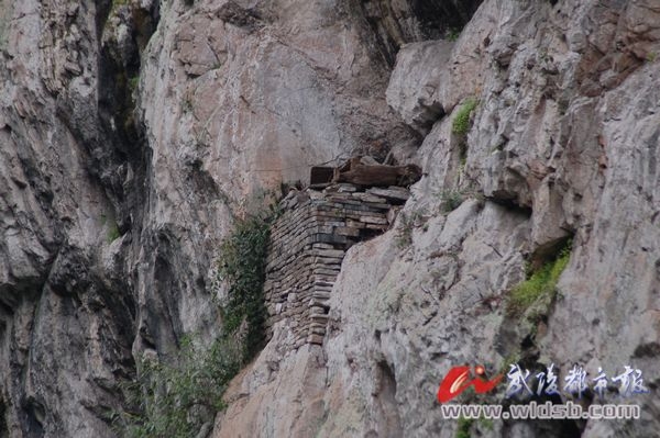 ??? 循著陳建波手指的地方望去,一座鑲嵌在懸崖絕壁上的寺廟讓人稱奇,這就是神崖廟。在神崖廟上方的絕壁上,一個天然洞穴外部被較為平整的條石封填,在這些條石的上方,還殘存著眾多露出崖面的原木及木板。