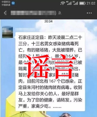 【謠言】石家莊正定縣:昨天凌晨二點二十三分,十三名男女生感染豬病毒死亡,有的豬場豬,大批被埋葬,已經死亡人數13人,最大的67歲,最小的9歲,參與搶救的醫生已被隔離,河北一臺電視新聞己播出,暫時別吃豬肉、家禽,特別是豬肉,目前河北已有167個已感染,正定縣朱河村的豬肉就有病毒,收到馬上發給你關心的人,最好是群友。為了您的健康,請轉發。污染嚴重,家禽少吃……