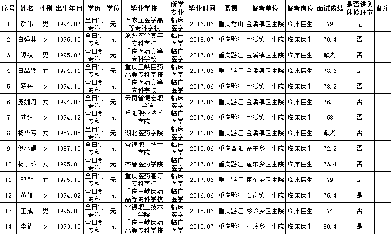 根據簡章規定,現將黔江區2018年公開考核招聘屬地化醫學類??粕嬖嚦煽兗斑M入體檢環節名單公布如下。請進入體檢環節的考生,于2018年8月27日上午8:30前空腹攜帶本人身份證、一張一寸彩色免冠近照、500元體檢費到黔江區老城人力社保局原辦公樓院內(城西七路3號)集中等候參加統一體檢。