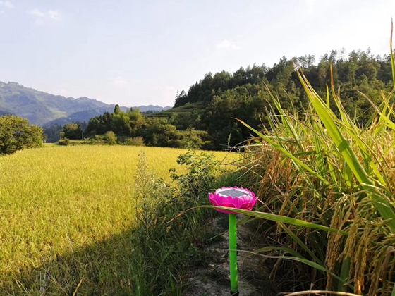 在水稻育苗期間,只要走進余和容家的田埂上,就能清晰地聽到插在田埂上的太陽能光明機播放音樂的聲音。這種音樂覆蓋范圍在一里地之內。
