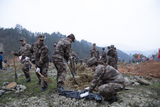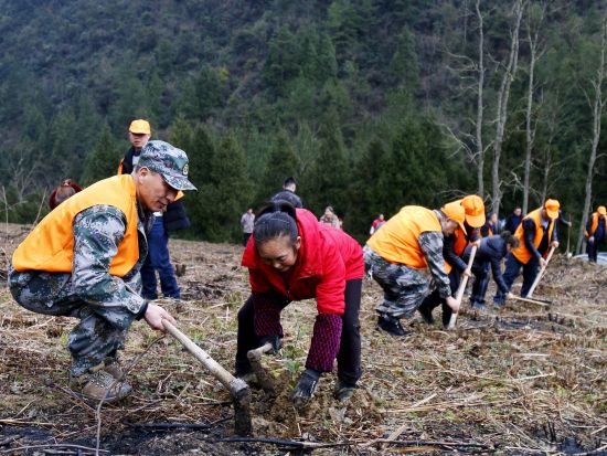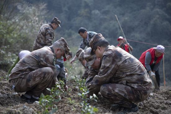 水市鄉帶領民兵預備役人員幫助貧困戶油茶栽種。 黔江區人武部供圖。