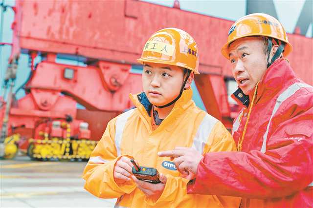 2019年2月20日,黔江區水市鄉的黃韜威第一天到洋山港上班,濯水古鎮的張興儒師傅手把手教他。(攝影 任光明 劉永鋒)