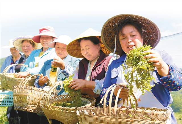 “今年這些藤茶長高了許多,發的嫩芽也多了,采摘起來要快些。我們去年第一次采摘,勾著腰桿就像在地上找針,半天還采不起1斤?!苯眨谇瓍^鄰鄂鎮五馬頂村一藤茶基地務工的羅美秀,與一起采摘藤茶的姐妹們拉開了家常。