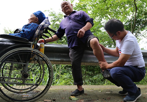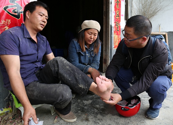 路途中停下來為低保戶陶承金經常腳痛作檢查。通訊員 譚鵬 攝