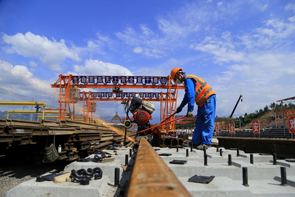 建設者進行人工鋪軌作業。華龍網-新重慶客戶端通訊員 譚帥 攝