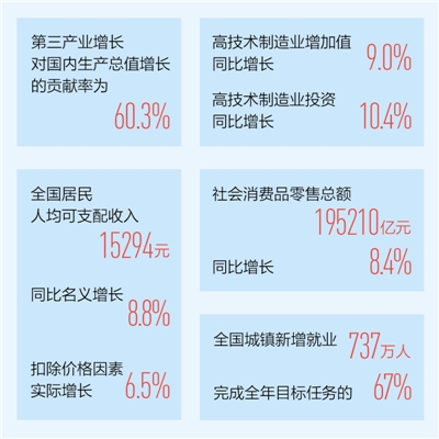 經濟增長平穩的同時,經濟結構持續優化。上半年,第三產業增加值占國內生產總值比重為54.9%,比上年同期提高0.5個百分點,比第二產業高15.0個百分點;第三產業增長對國內生產總值增長的貢獻率為60.3%,高于第二產業23.2個百分點;規模以上工業中戰略性新興產業和高技術產業保持快速增長。最終消費支出增長對經濟增長的貢獻率為60.1%。
