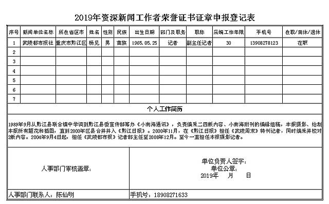 2019年資深新聞工作者榮譽(yù)證書證章申報(bào)登記表