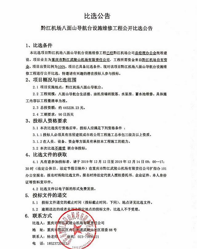 黔江機場八面山導航臺設施維修工程公開必選公告