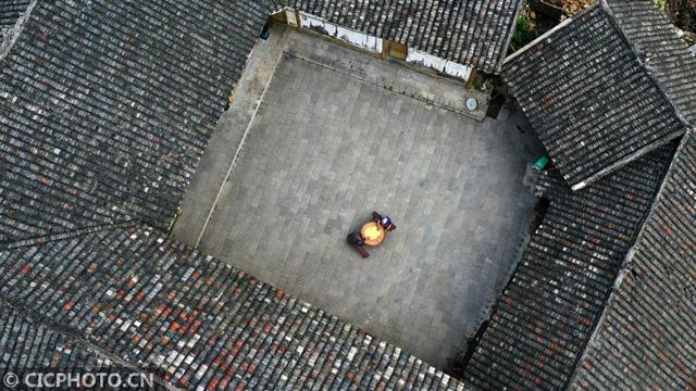 ↑2020年6月6日,重慶市黔江區馮家街道寨子社區官村古寨村民在分揀糧食。(無人機照片)CICPHOTO/楊敏 攝