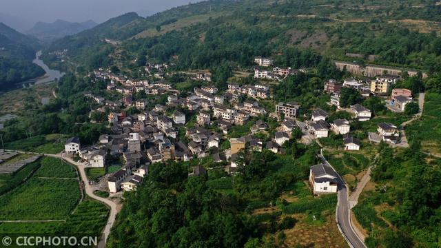 ↑2020年6月6日,重慶市黔江區馮家街道寨子社區官村古寨與現代農業園相互映襯。(無人機照片)CICPHOTO/楊敏 攝