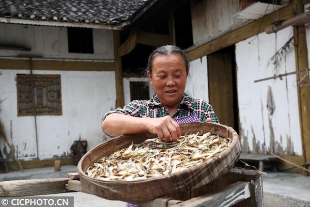 ↑2020年6月6日,重慶市黔江區馮家街道寨子社區官村古寨村民在晾曬小魚片。CICPHOTO/楊敏 攝