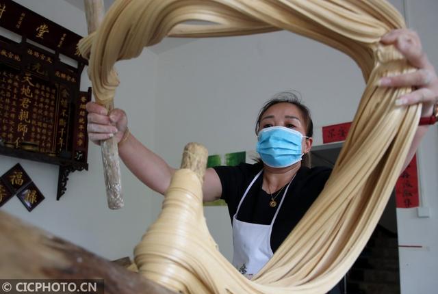 ↑2020年6月4日,重慶市黔江區馮家街道寨子社區官村古寨村民在制作玉米麻糖。CICPHOTO/楊敏 攝