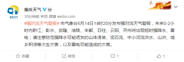 重慶市氣象臺6月14日14時20分發布強對流天氣警報,未來0-2小時內黔江、彭水、武隆、涪陵、豐都、石柱、云陽、開州將出現短時強降水、雷電;請注意防范強降水可能誘發的山體滑坡、泥石流、中小河流洪水、山洪、城鄉積澇等次生災害,以及雷電可能造成的災害。
