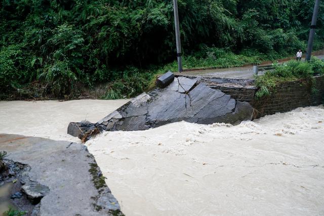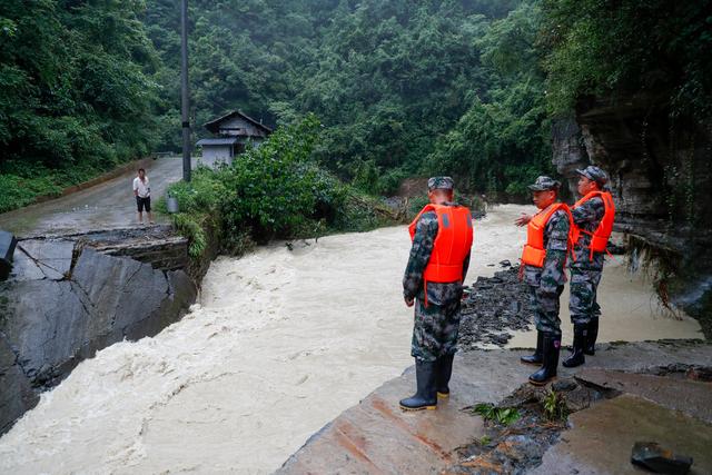 7月1日,在重慶市黔江區金溪鎮平溪村,當地政府工作人員在被洪水沖毀的康家河溝橋旁值守。