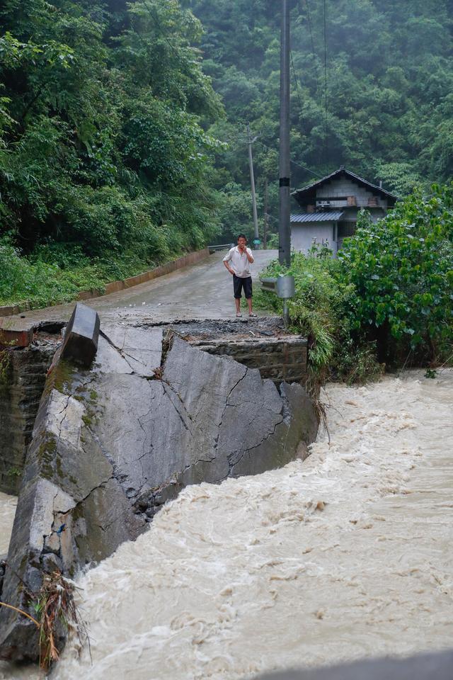 7月1日,在重慶市黔江區金溪鎮平溪村,村民站在被洪水沖毀的康家河溝橋旁。