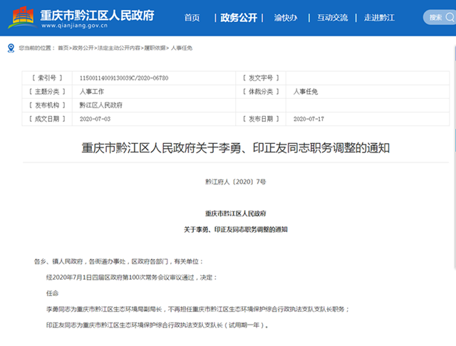 李勇同志為重慶市黔江區生態環境局副局長,不再擔任重慶市黔江區生態環境保護綜合行政執法支隊支隊長職務;