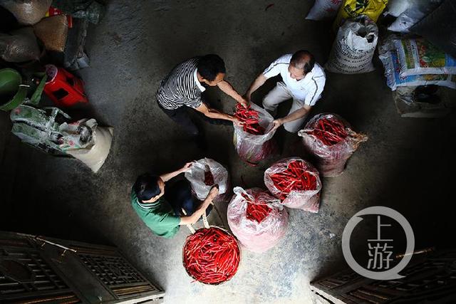 9月11日,重慶市黔江區杉嶺鄉林峰社區“第一書記”杜建(左)和扶貧工作隊員幫助李賢余(中)整理辣椒。