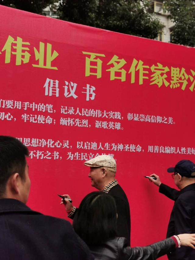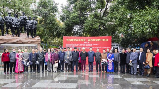 黔江區委領導及百位作家在紅軍廣場共同舉行"書寫建黨百年偉業,百名作家黔江倡議"簽字儀式,倡導廣大作家寫出新時代民族奮進作品。