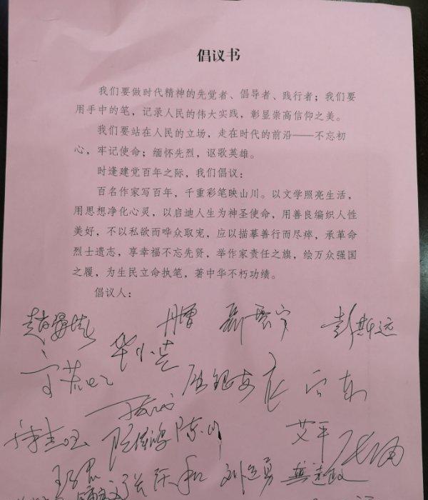 著名作家陳川、田瑛、劉愛萍、張慶和、王子君、高若虹、雷子、華小克、王明凱、劉運勇、彭斯遠、邢秀玲、何炬學、王雨、糜建國、張涌等參加了倡議活動。