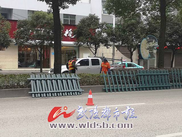 當日下午,記者在新華大道中心醫院路口看到,數位身穿紅色馬甲的園林工人,正忙著把靠在綠化帶旁的數個圍欄,一個個安裝在綠化帶周圍。
