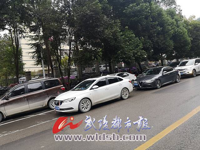 近日,記者就此問題在中心醫(yī)院附近進行了蹲點,發(fā)現(xiàn)早上八九點醫(yī)院門前這條南北向的路的北段上,很多車輛找不到車位,就干脆直接停在了道路上,堵住了停在停車位上的車(如圖),后面的駕駛員分不清道路上哪輛車是停著的,哪些是準(zhǔn)備行駛的,急促地按著喇叭。