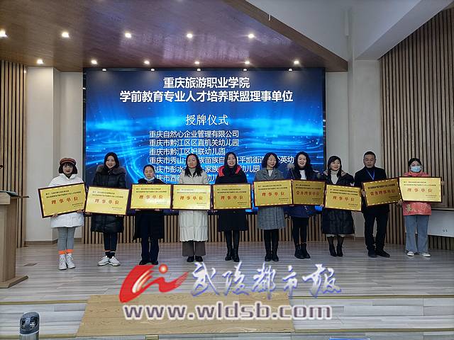 本報訊(記者 陶原 文/圖)近日,重慶旅游職業學院學前教育專業人才培養聯盟召開成立大會并集中授牌(如下圖)。來自黔江區、彭水縣、酉陽縣、秀山縣等10多所幼兒園及幼兒教育集團負責人,重慶旅游職業學院相關職能處室、院系負責人和部分師生代表參加會議。