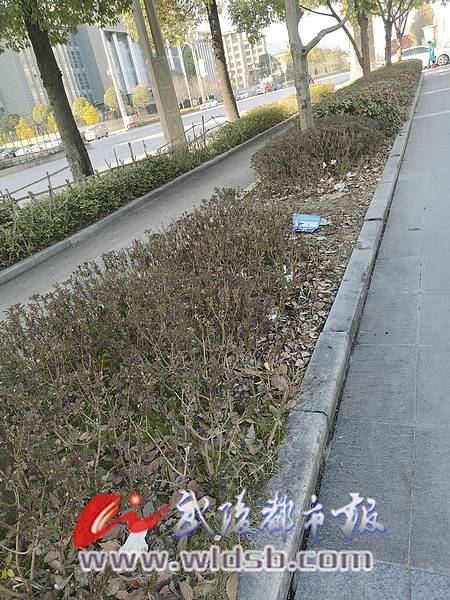 1月24日上午,記者隨意來到武陵大道旁的一處花壇,遠(yuǎn)遠(yuǎn)的看到路邊各式花整齊排列,給新城增添了不少美色,可走近一些,紅的、白的塑料瓶、垃圾袋、煙頭等垃圾隨處可見。