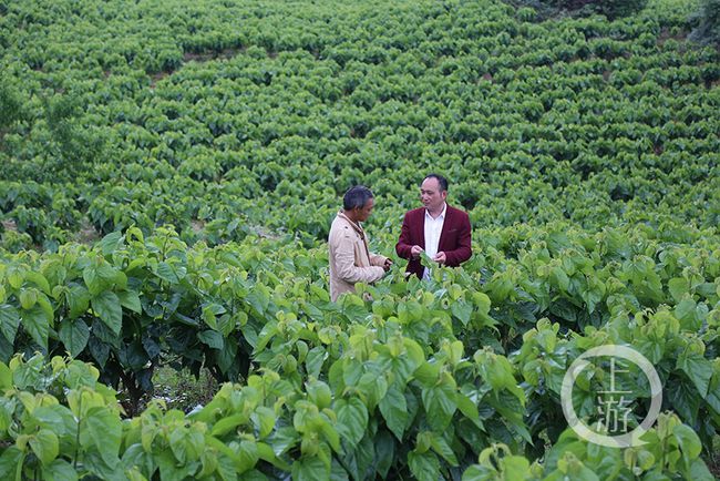 田景紅一家3口,妻子王萬香多病,兒子在外務工。針對田景紅的貧困情況,白土鄉政府干部為他家制定了脫貧方案,先是幫助田景紅修建了新房,解決了住房問題,同時幫助田景紅發展蠶桑產業,種植了50多畝蠶桑,建起了養蠶大棚。圖為田景紅(左)在和鄉上農技人員交流蠶桑管理技術。