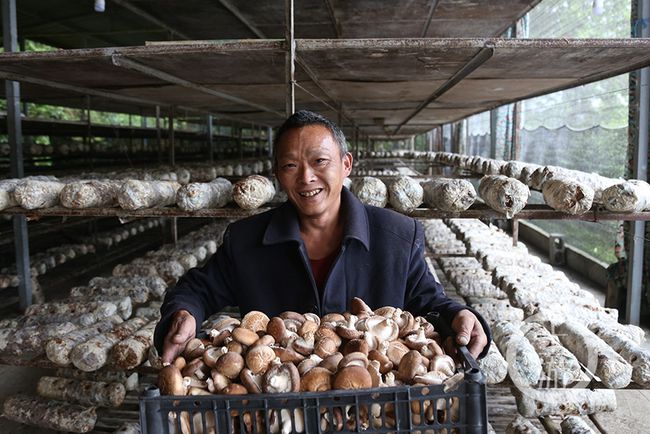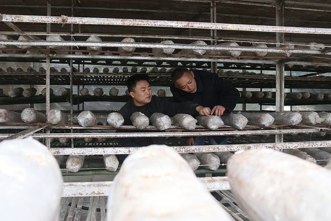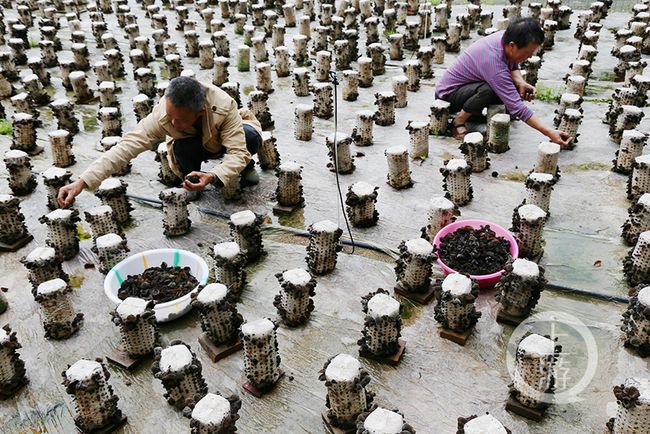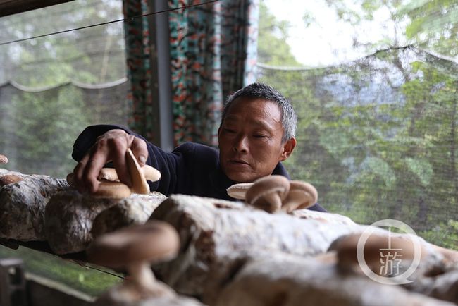 為了把養蠶外的空閑時間利用起來,白土鄉政府還幫助田景紅在新房旁發展了500棒黑木耳,并利用蠶棚的空閑期發展了3000棒香菇種植,均喜獲豐收。圖為田景紅和妻子采收木耳。