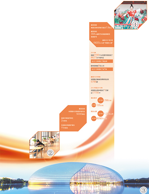 100年,翻天覆地,中國(guó)文化的實(shí)力令人刮目相看:今天的中國(guó)是世界第一出版大國(guó),每年出版圖書超過50萬種,發(fā)行100億多冊(cè);今天的中國(guó)是世界第二電影大國(guó),每年拍攝各類電影近千部,票房600多億元;今天的中國(guó)擁有5800多家博物館、近3200家公共圖書館和22.5萬家書店,每年參觀博物館的人次超過10億、借閱圖書近7億冊(cè);今天的中國(guó)人每年觀看各類演出超過11億人次;今天的中國(guó)99%的人口可以收看收聽電視廣播,所有行政村都建有農(nóng)家書屋、電子閱覽室和文化活動(dòng)室……