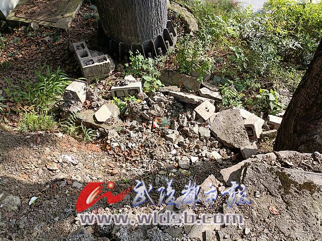 當(dāng)日上午,記者在現(xiàn)場看到,這些碎磚頭堆積在公路邊的斜坡上,還有許多碎石塊,據(jù)觀察是此地公路邊沿的路表被壓壞,沿著斜坡滾到了一起。龔女士指著這些碎磚對記者說:“你看這些碎磚亂七八糟的堆在一起,把這棵大樹的底部完全淹沒了(如圖)。加上碎磚頭如果受大風(fēng)、暴雨等外力影響,很容易沿著斜坡滾落到下面的河濱步道上,有很大的安全隱患。”