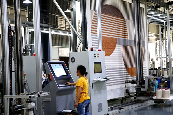 近年來,黔江區大力發展大數據、人工智能、軟件服務、物聯網、智能制造等智能產業,多家企業已從傳統的手工生產走向智能化生產,促進了實體經濟與人工智能、大數據、互聯網技術的深度融合,推動傳統產業智能化改造提升。企業通過智能化改造,實現了用智能化、自動化、無塵化生產替代傳統手工、半自動生產,確保了操作人員健康,保證了產品質量,還降低了生產成本。圖為8月4日,在黔江區華美地毯廠,工人監視機器人生產地毯。