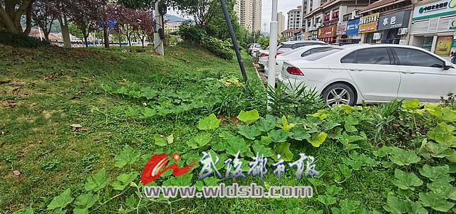 8月17日上午,根據市民提供的線索,記者來到了現場,該處位于黔江碧桂園商業街外,緊鄰武陵大道,在公共花圃里,原本是種植的景觀樹和草坪,現在卻種植了不少蔬菜,成為一片“城市菜園”。