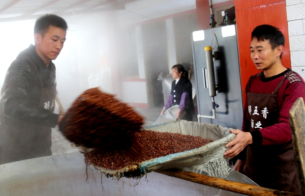 11月18日,記者走進(jìn)海拔1100米的黔江區(qū)鄰鄂鎮(zhèn)艾坪村一農(nóng)戶(hù)家,濃濃的蒸霧彌漫四周,散發(fā)出陣陣酒香味,屋內(nèi)被霧氣罩著的兩男子,正忙著將蒸鍋里蒸好的高粱出鍋。
