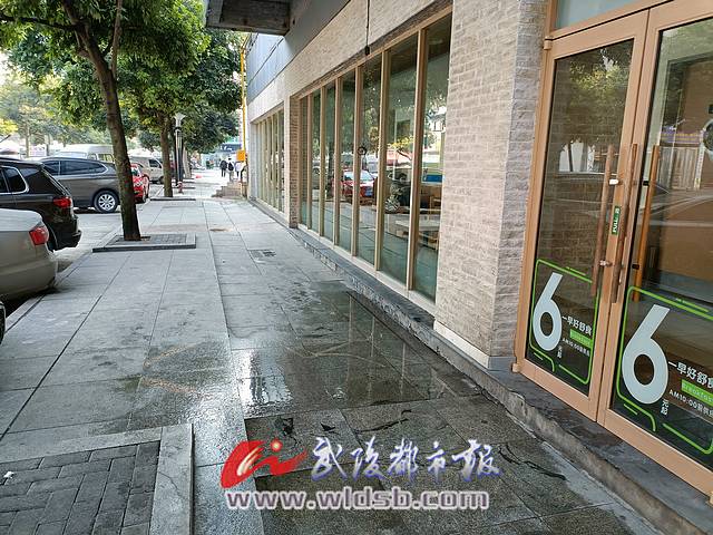 記者在現場看到,該人行道上長約5米的一段路地面濕漉漉的,仰頭一看是二樓的一處水管正不斷的滲漏,滴下的水滴在地面濺起片片水花,過往的行人紛紛繞路而行。