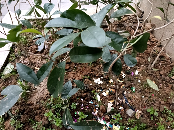 當日傍晚,記者在現場看到,山臺山小區外面新種植綠植的三個花壇內,紙屑、鞭炮皮、塑料袋等各類生活垃圾應有盡有,由于植被新移植不久,還有不少黃土裸露著,這讓花壇內的生活垃圾更為顯眼了(如圖)。