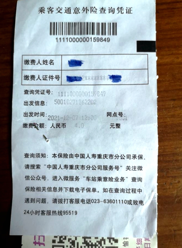 就在上個月,周先生從重慶回黔江就又遇上這樣的煩心事。眼看離發車時間還有5分鐘,通過安檢后急匆匆來到售票窗口,將身份證和現金從售票窗口遞進去,說了購票時間和到達地點,售票員很快就將身份證、車票和找補的零鈔一起遞出窗口,周先生拿過手一看只找補6元,還有一小張4元的《乘客交通意外險查詢憑證》,周先生想找售票員理論,一看離發車時間越來越近,只得硬著頭皮拿著票走到檢票口匆匆上車。