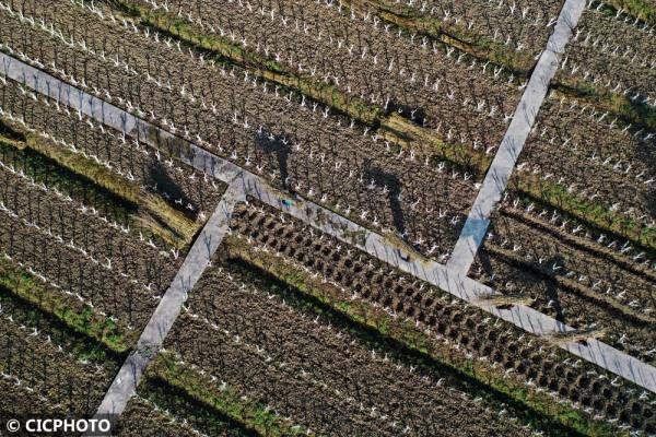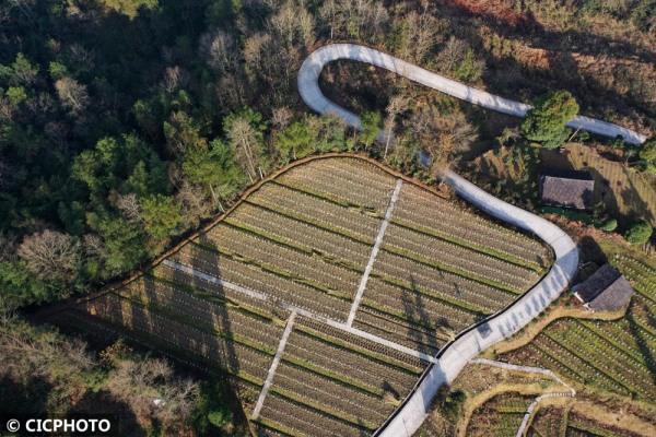 2022年1月18日,重慶市黔江區沙壩鎮西泡村村民在整理桑園,準備施肥。(無人機照片)CICPHOTO/楊敏 攝