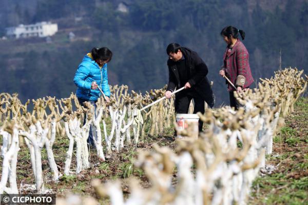 2022年1月18日,重慶市黔江區沙壩鎮西泡村村民在給桑樹刷防蟲石灰水。CICPHOTO/楊敏 攝