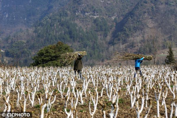 2022年1月18日,重慶市黔江區沙壩鎮西泡村村民在搬運桑枝,整理桑園。CICPHOTO/楊敏 攝