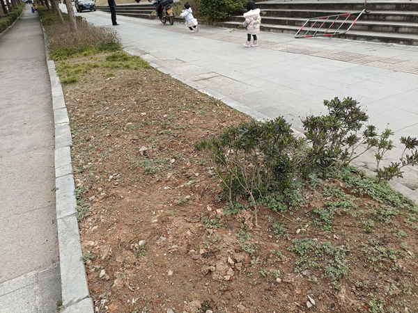 當日上午天氣晴朗,記者在現場看到,天生湖廣場上人滿為患,不少家長帶著孩子來這里曬太陽,而廣場旁邊長約百米的綠化帶內,細數下來竟有五六條被踩出來的小路。在記者蹲守的約10分鐘時間里,就有十幾人為了節省時間,從綠化帶內踩過?!澳憧淳G化帶兩頭,只剩下幾株長勢稍高的灌木,其他地方都能看到裸露的泥土了。這樣長期下去。綠化帶只會更加難看?!?/p>