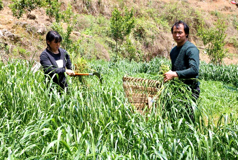 4月11日,酉陽自治縣李溪鎮,藍天白云下的長沙村青山蔥蘢,大地鋪綠,當地養殖大戶雷洪迎著初升的太陽,與妻子崔遠民來到田間收割牧草,為家里養殖的牛羊準備“早餐”。