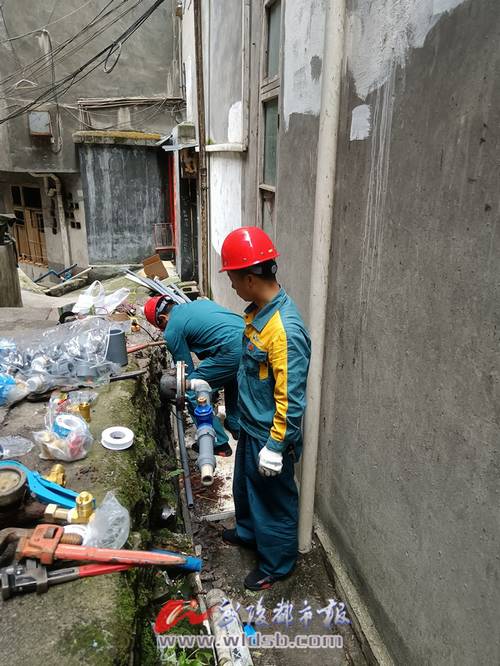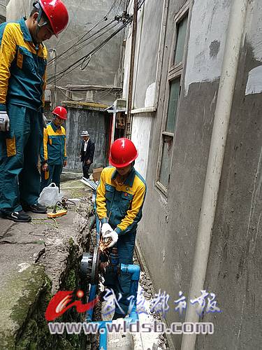 4月26日早上9點半鐘,黔江區城東街道官壩居委古樓巷50號一棟居民樓旁邊半米多寬的邊溝里,來自黔江區泰來宏達自來水有限公司運行維護科的3名工人師傅已經開始了緊張的工作,他們有條不紊地切割、接頭、換管……房屋的主人——84歲的陳昌杰老人從家里端出熱茶,好一派其樂融融的勞動場面!