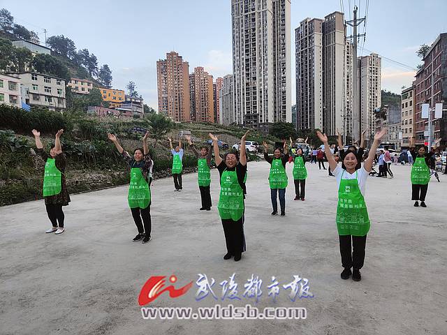 本報訊(記者 黃英 文/圖)近日,在黔江區石峽廣場,一群穿戴綠色圍裙的居民,跳著宣傳垃圾分類的壩壩舞(如下圖),臉上洋溢著喜悅之情,引來不少路人駐足觀看。