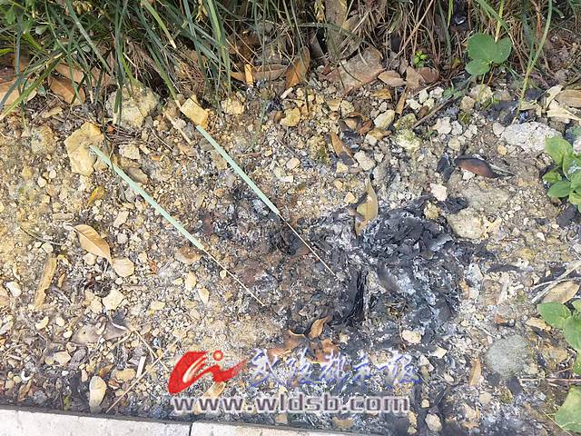 在河濱南路西段的一處草坪內(nèi),還殘留有未完全燃燒的冥幣及兩柱未燃燒的香(如圖)。