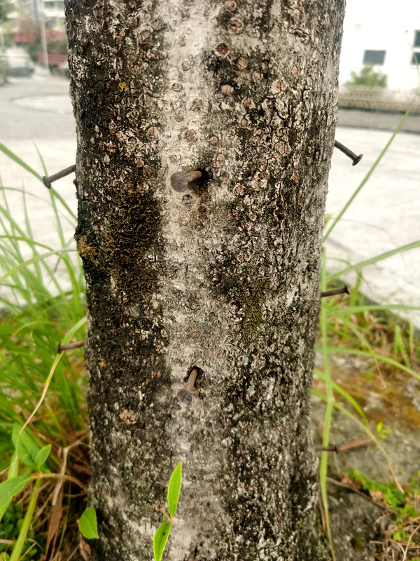 但在采訪時,有市民提出了質疑,為什么每棵樹上都有釘子,并且排列較整齊,懷疑可能是運輸景觀樹時,釘木板所致。