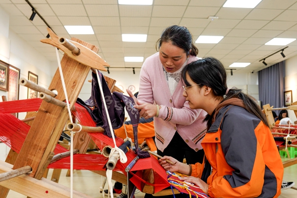 10月27日,重慶市黔江區(qū)民族職業(yè)教育中心的學(xué)生在老師(左)的指導(dǎo)下進(jìn)行西蘭卡普(土家語(yǔ),意為土花鋪蓋)織錦練習(xí)