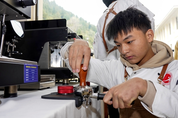 10月27日,重慶市黔江區(qū)民族職業(yè)教育中心的學(xué)生在實(shí)訓(xùn)課上練習(xí)制作咖啡。
