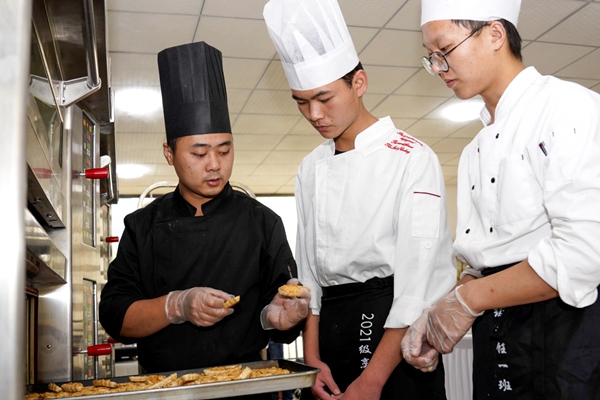10月27日,重慶市黔江區(qū)民族職業(yè)教育中心的老師(左一)在烘焙實(shí)訓(xùn)課上指導(dǎo)學(xué)生進(jìn)行西式糕點(diǎn)的烘焙。
