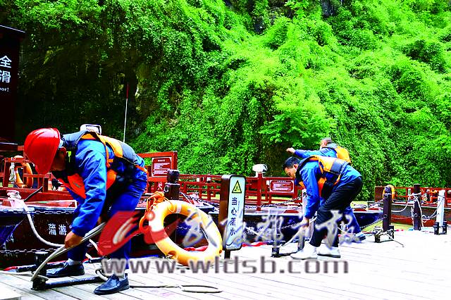 據了解,此次演習模擬的是雨季時期暗河水位大幅上漲,以及浮泵碼頭發生斷纜事故等相關救援搶險工作。演習中,隨著總指揮一聲令下,各應急小組人員迅速進入演習狀態,緊張有序地開展了緊急疏散游客、實時監測水位、轉移碼頭物資、檢查船舶纜繩、清理船舶積水、運送搶險物資、加固浮泵碼頭等任務。